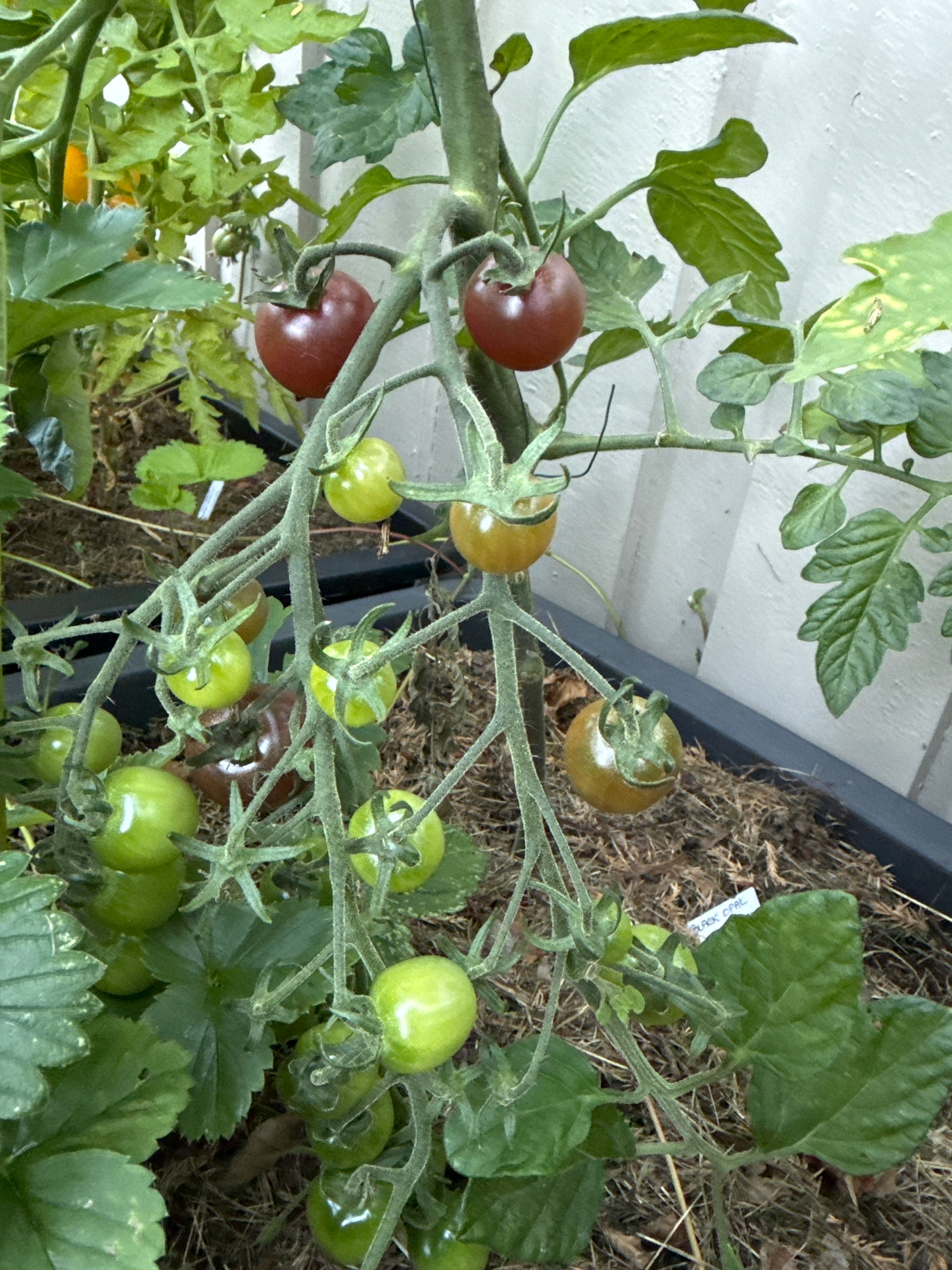 Black Opal produserer runde cherrytomater. Mørkebrunsvarte frukter med en velbalansert, søt og utmerket tomatsmak.