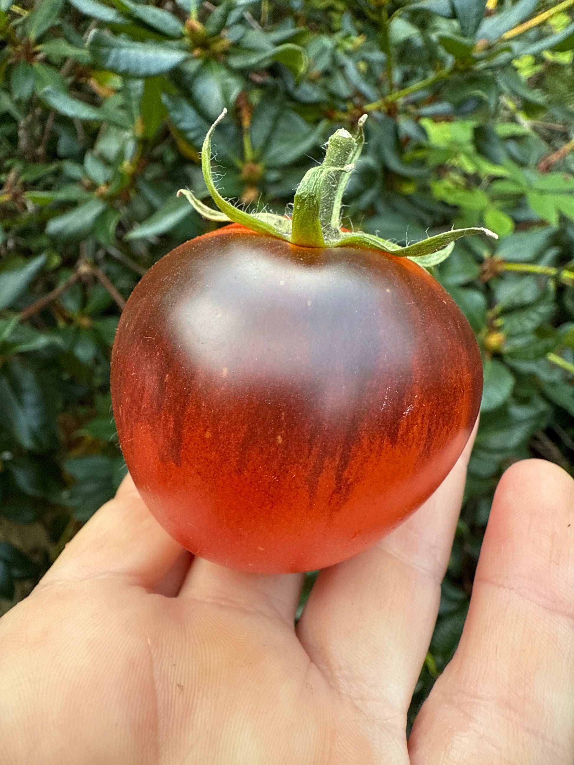 Dark Galaxy produserer runde til flate tomater av normal størrelse på rundt 60–200 gram hver.