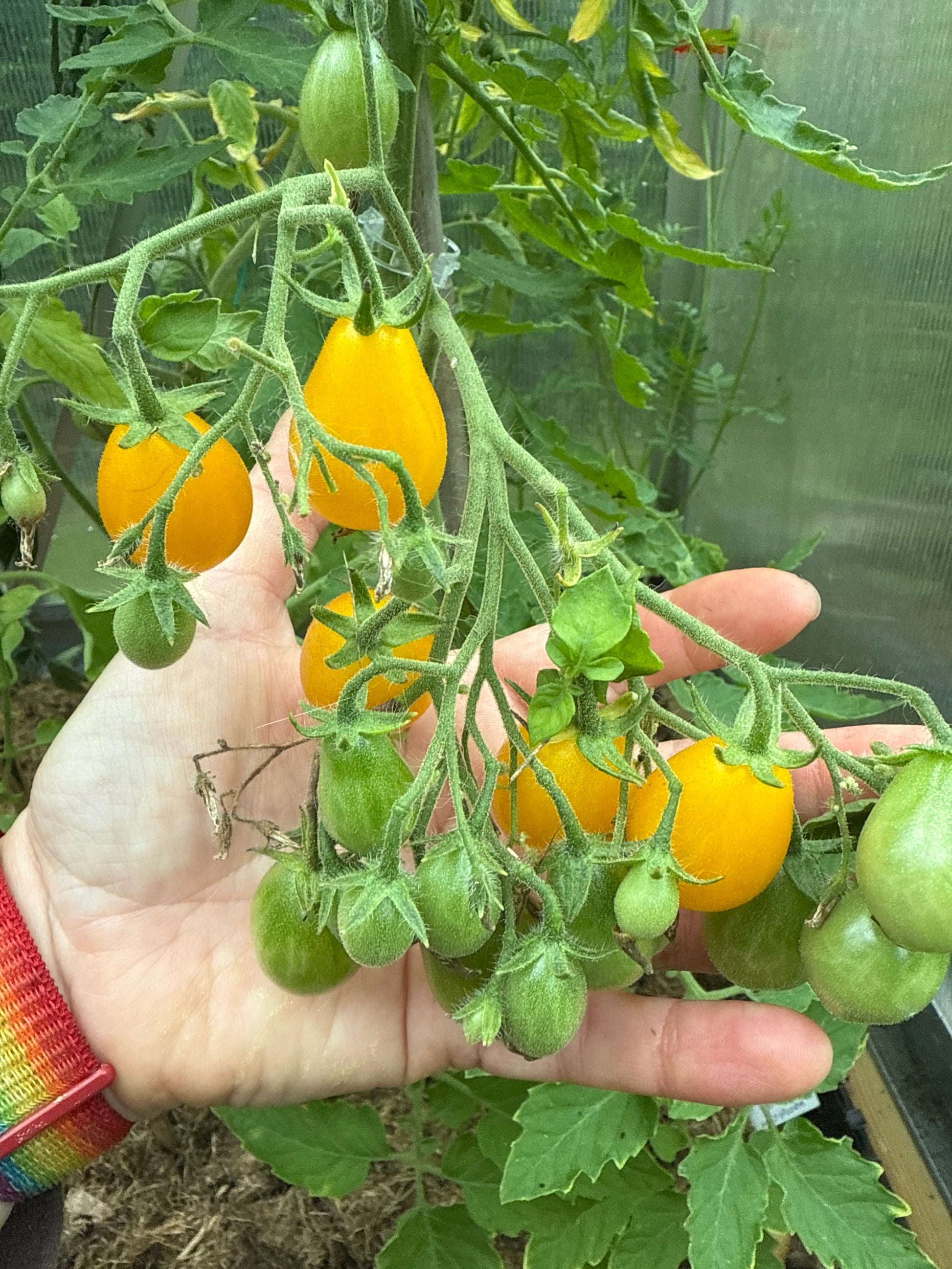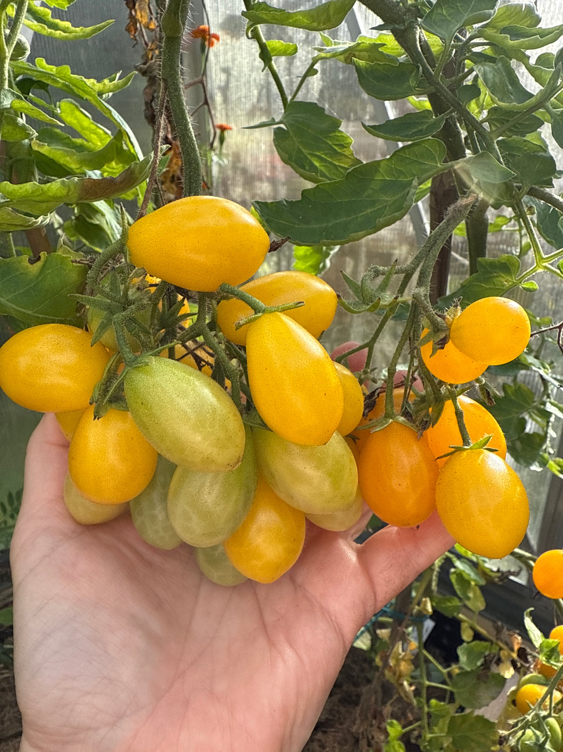 Ovale, til pæreformede, avlange frukter med saftig fruktkjøtt med en fruktig, søt tomatsmak. Gyllengul-oransje frukter med gyllent fruktkjøtt.