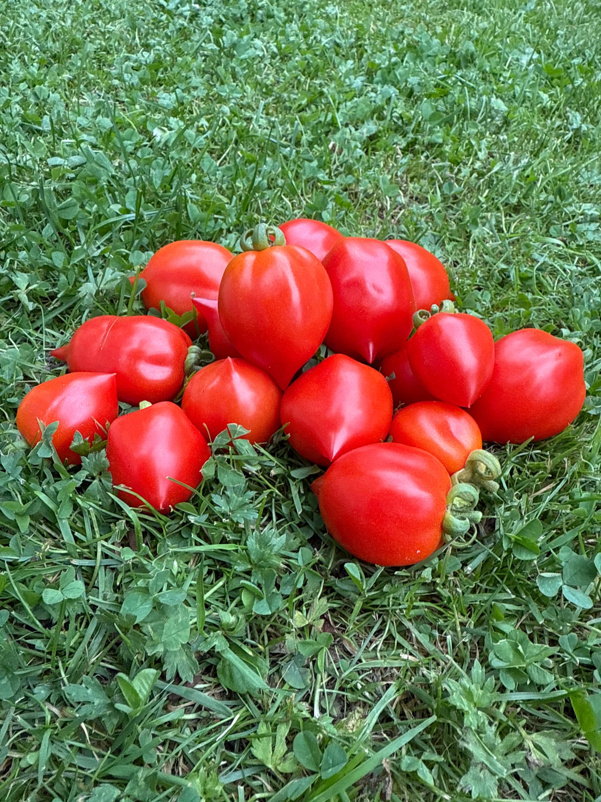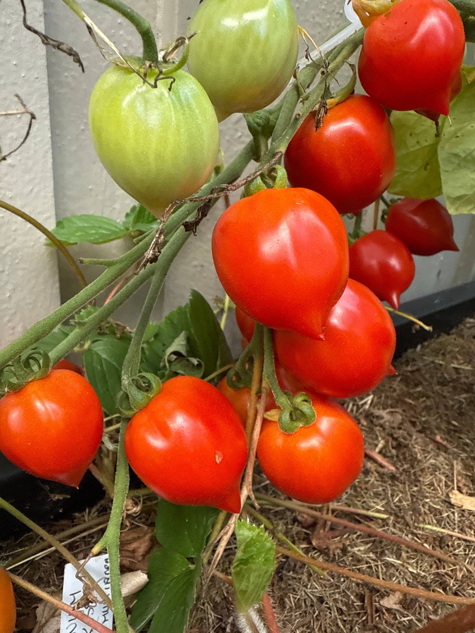 En litt uvanlig multifloratomat med små røde tomater med en spiss i enden. Litt større enn ett kirsebær.