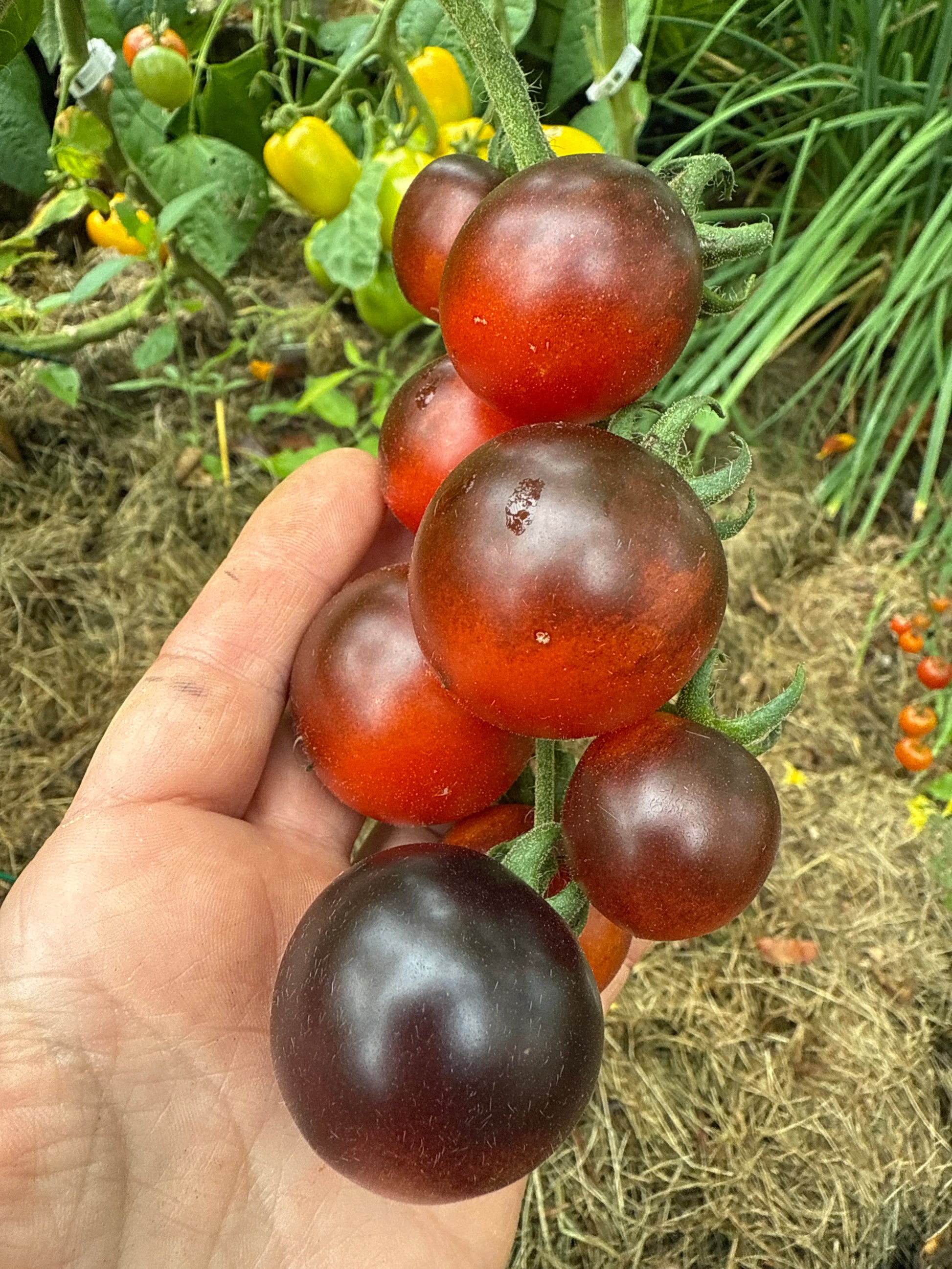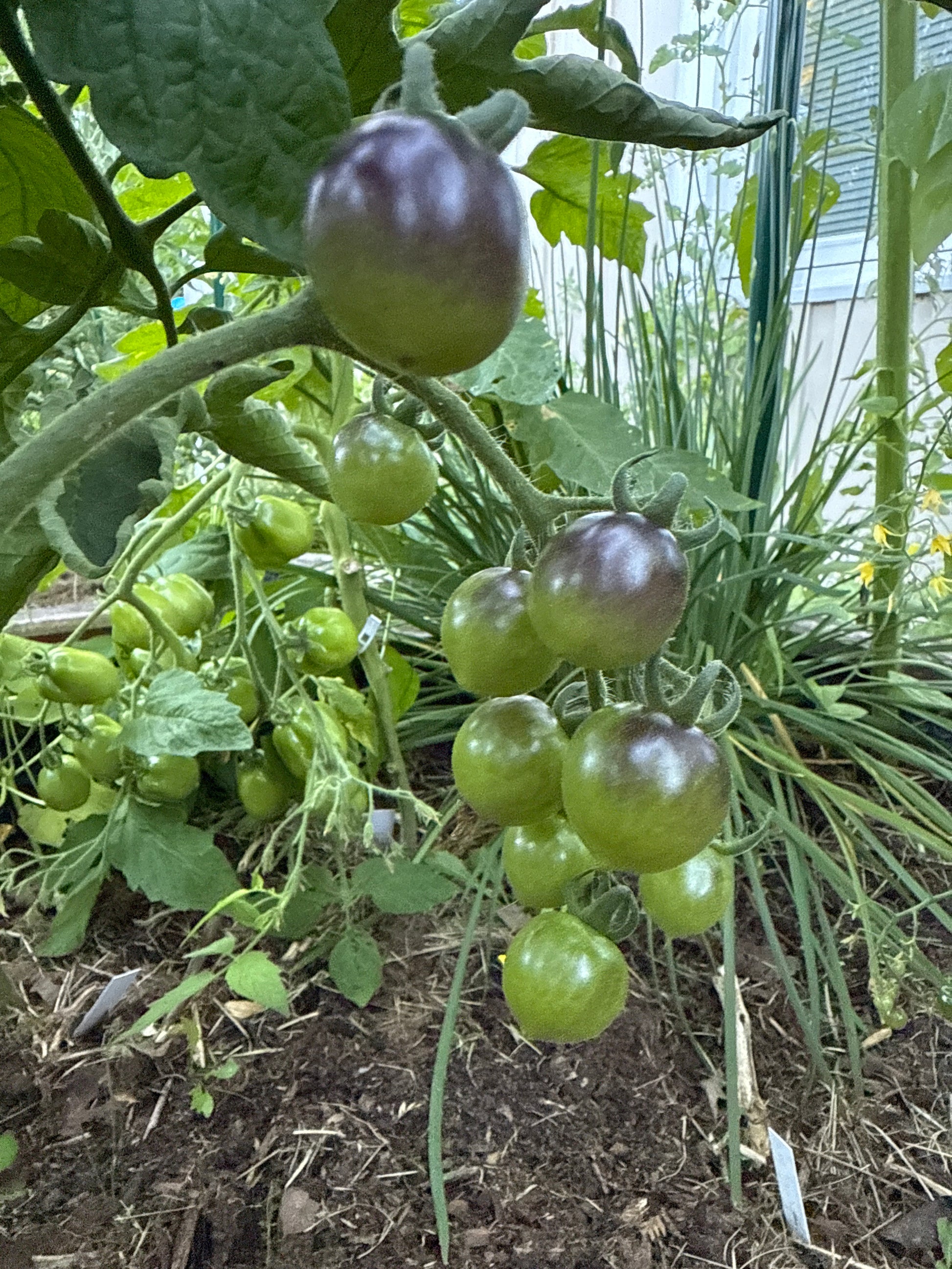Helsing Junction Blues produserer runde cherrytomater. Vakre frukter som modnes fra svartgrønn til karmosinrød-antho-lilla. Mer syrlig enn søt tomatsmak.