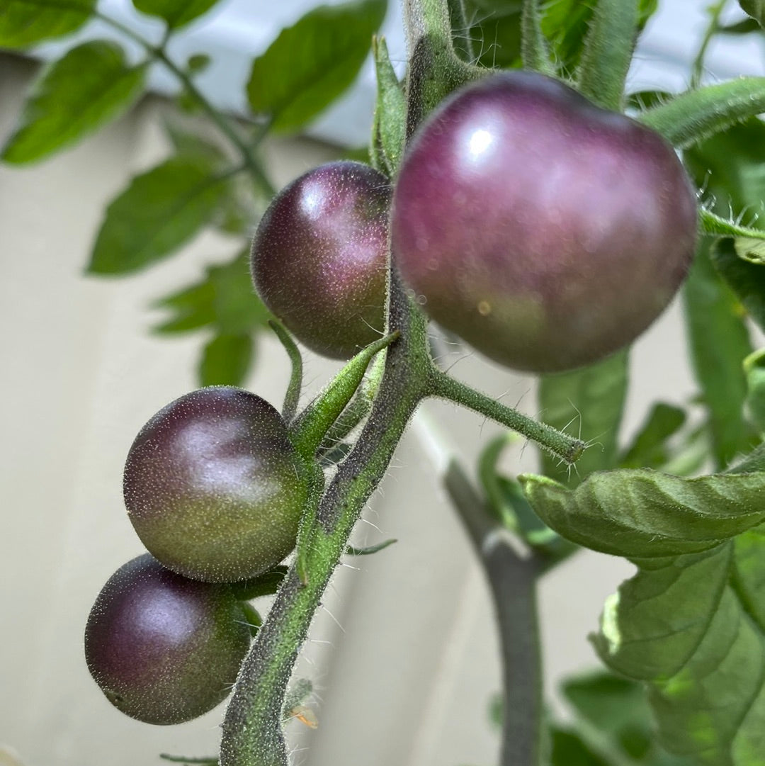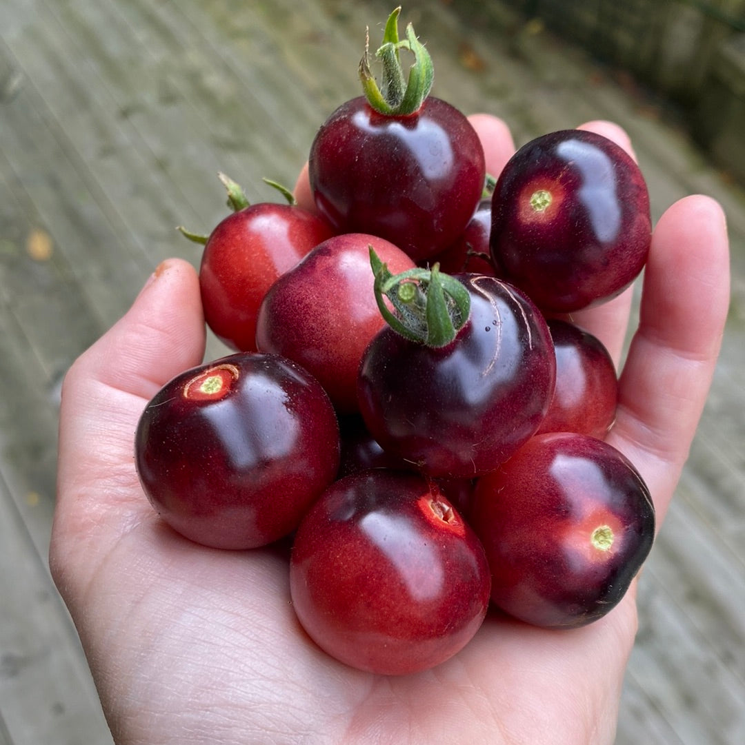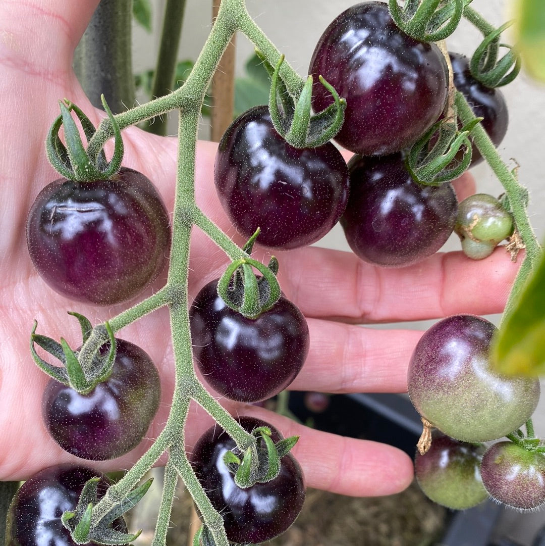 En fantastisk fin cherrytomat, med mange rosa/lilla tomater med blåsvarte skuldre.