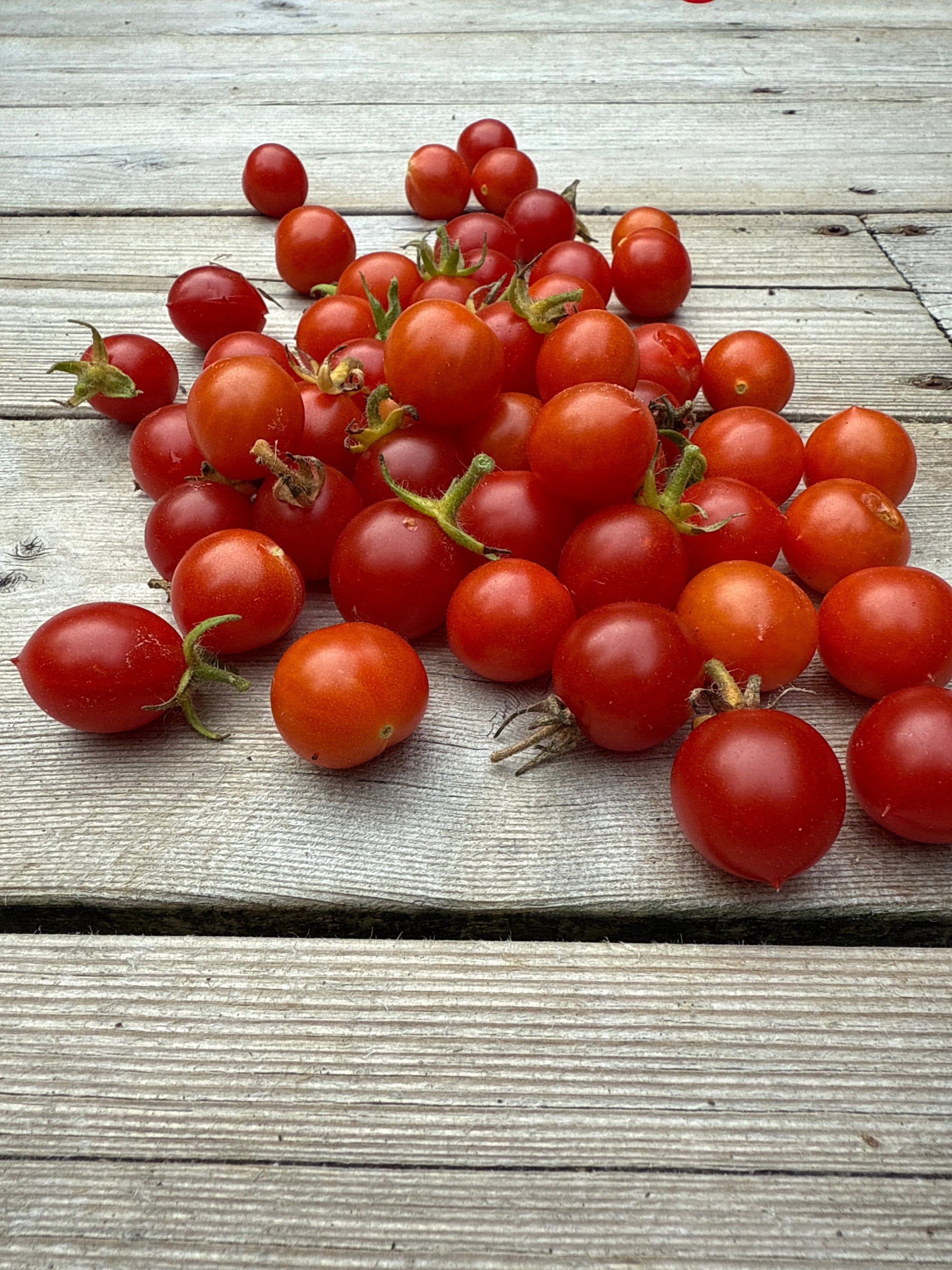 Runde, knallrøde frukter med en behagelig søt tomatsmak.