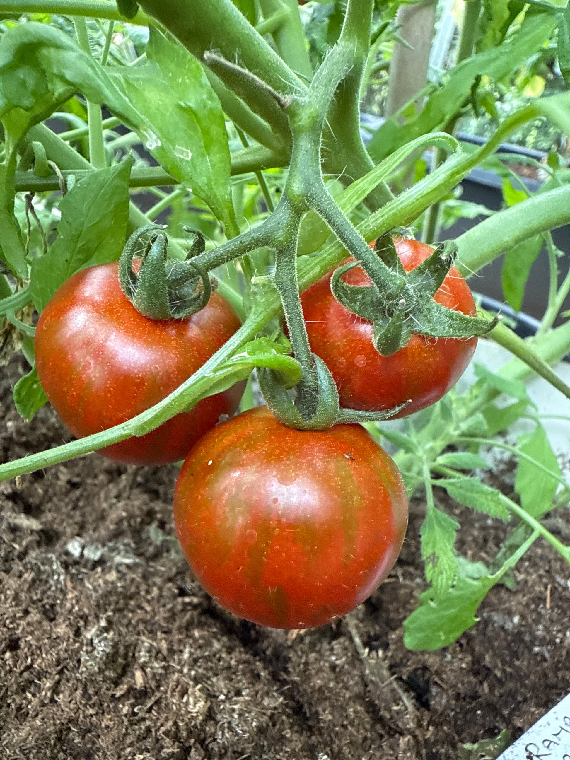 Kraftige planter som vokser opptil 60 cm. Produserer iøynefallende grønn-rød-stripete, store cherrytomater. Hver frukt veier rundt 30-40 gram.