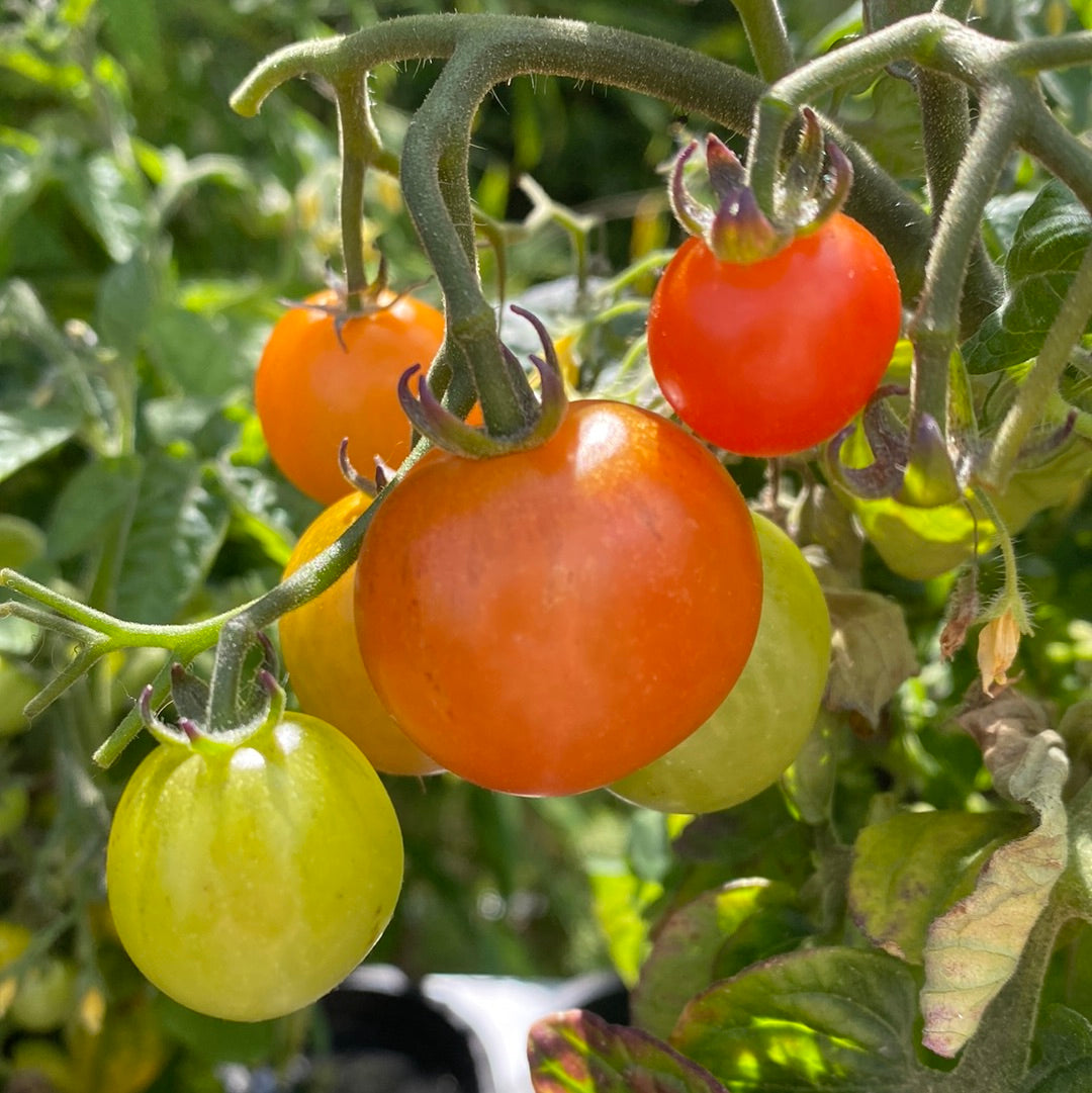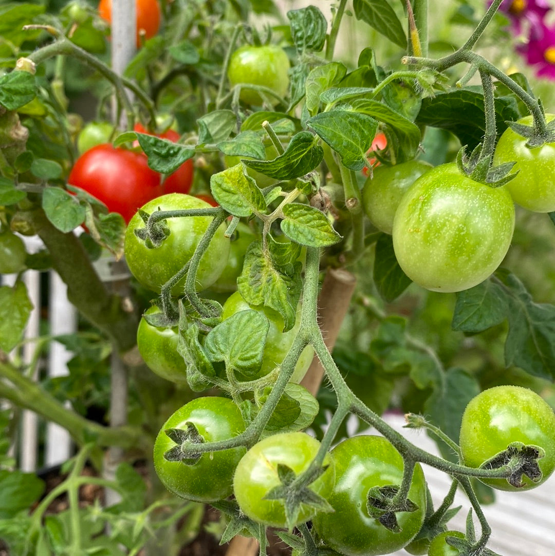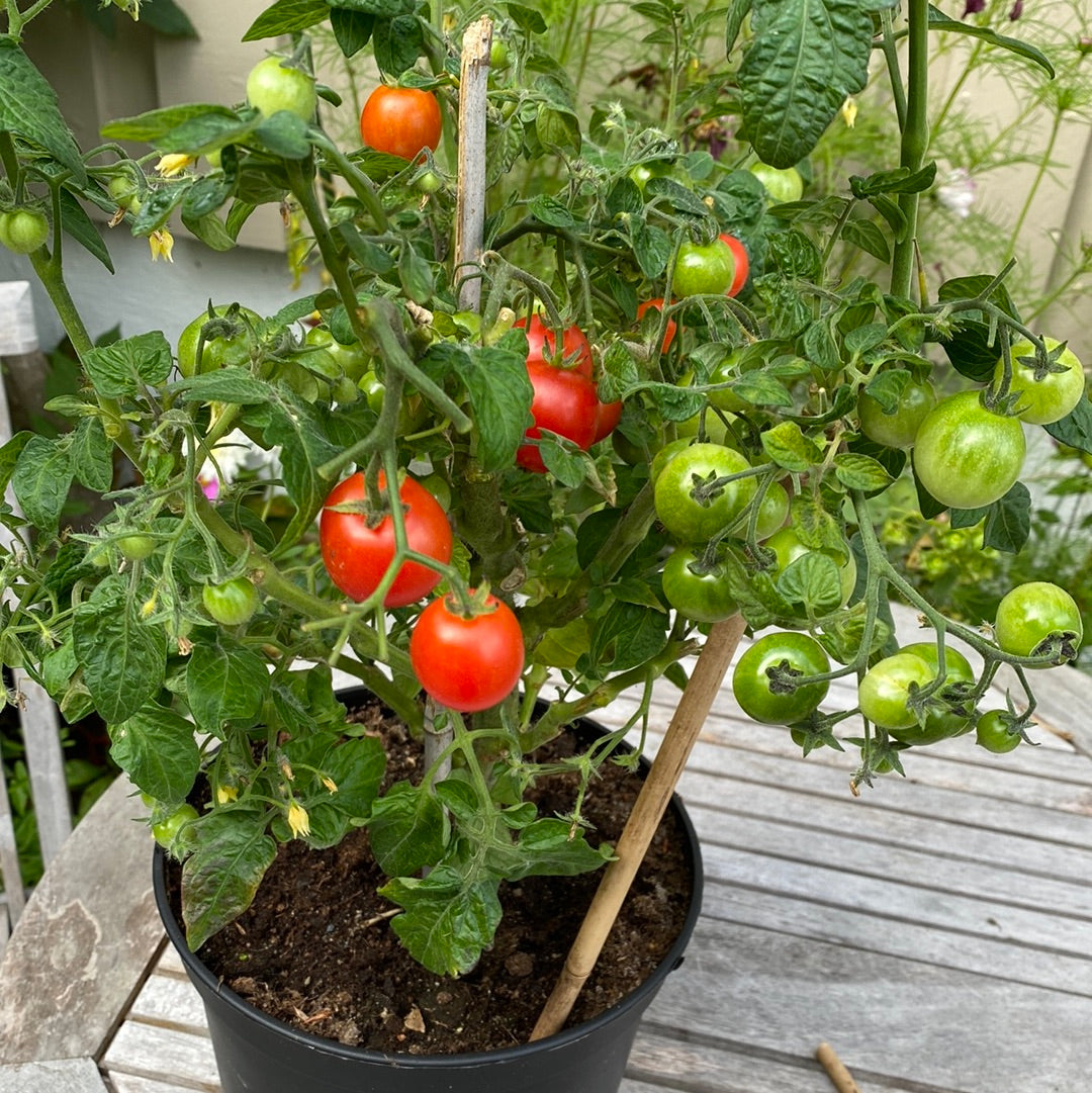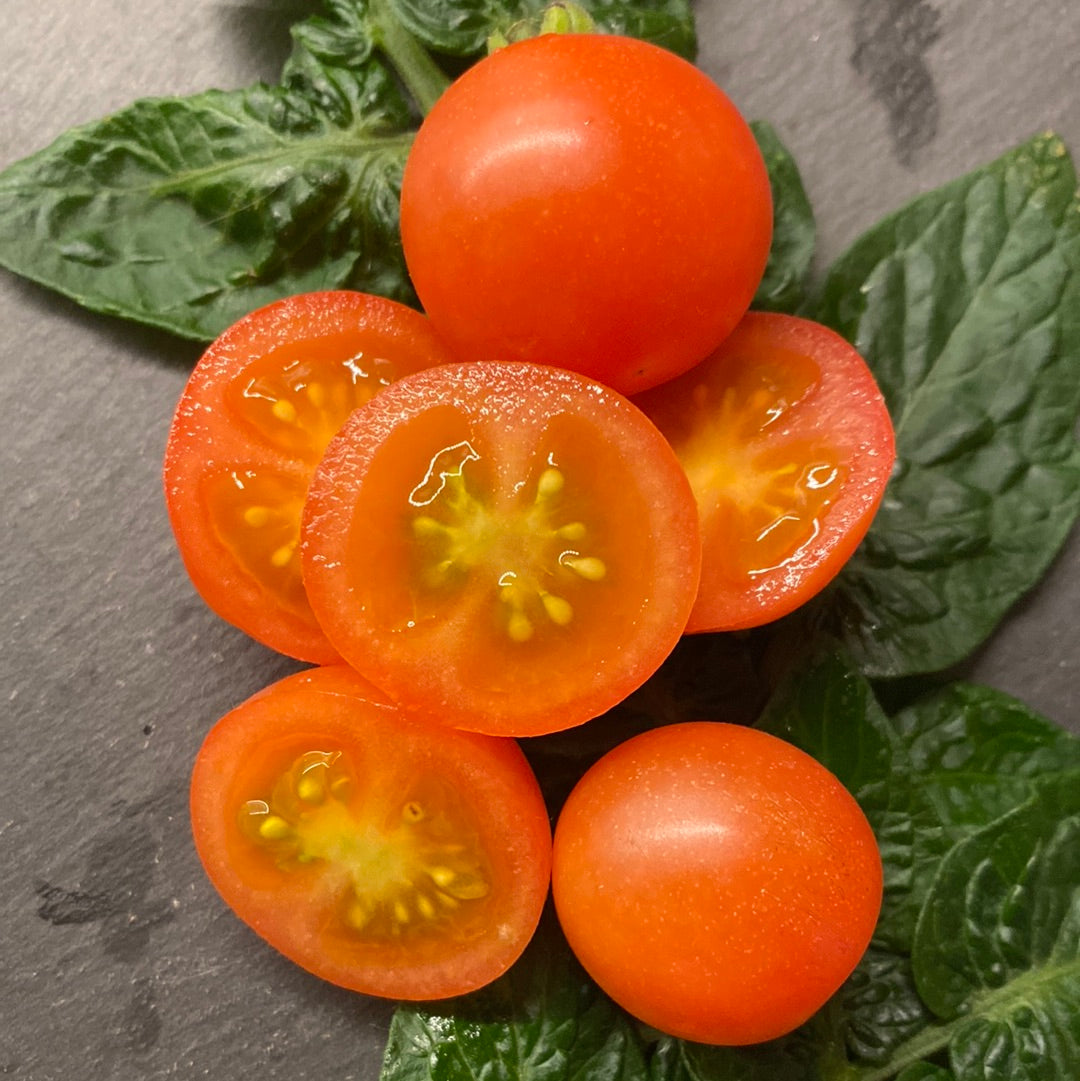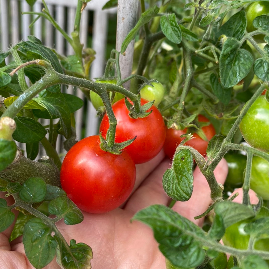 En kompakt plante som produserer mange, ekstra saftige, røde cherrytomater.
