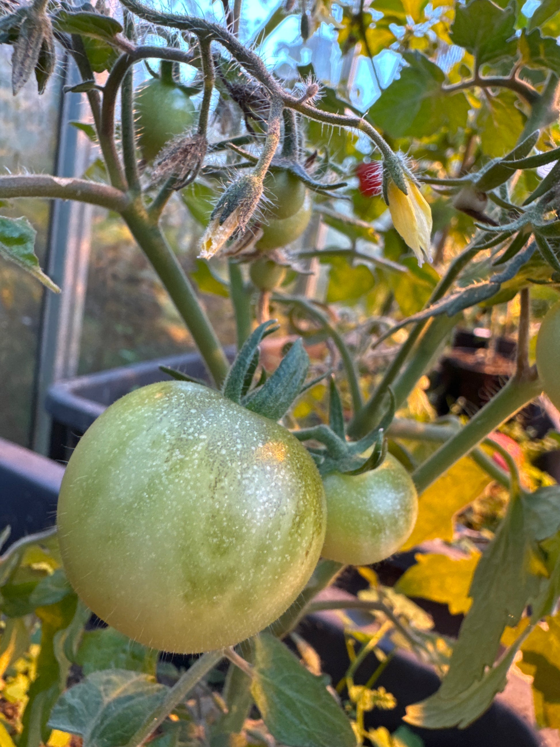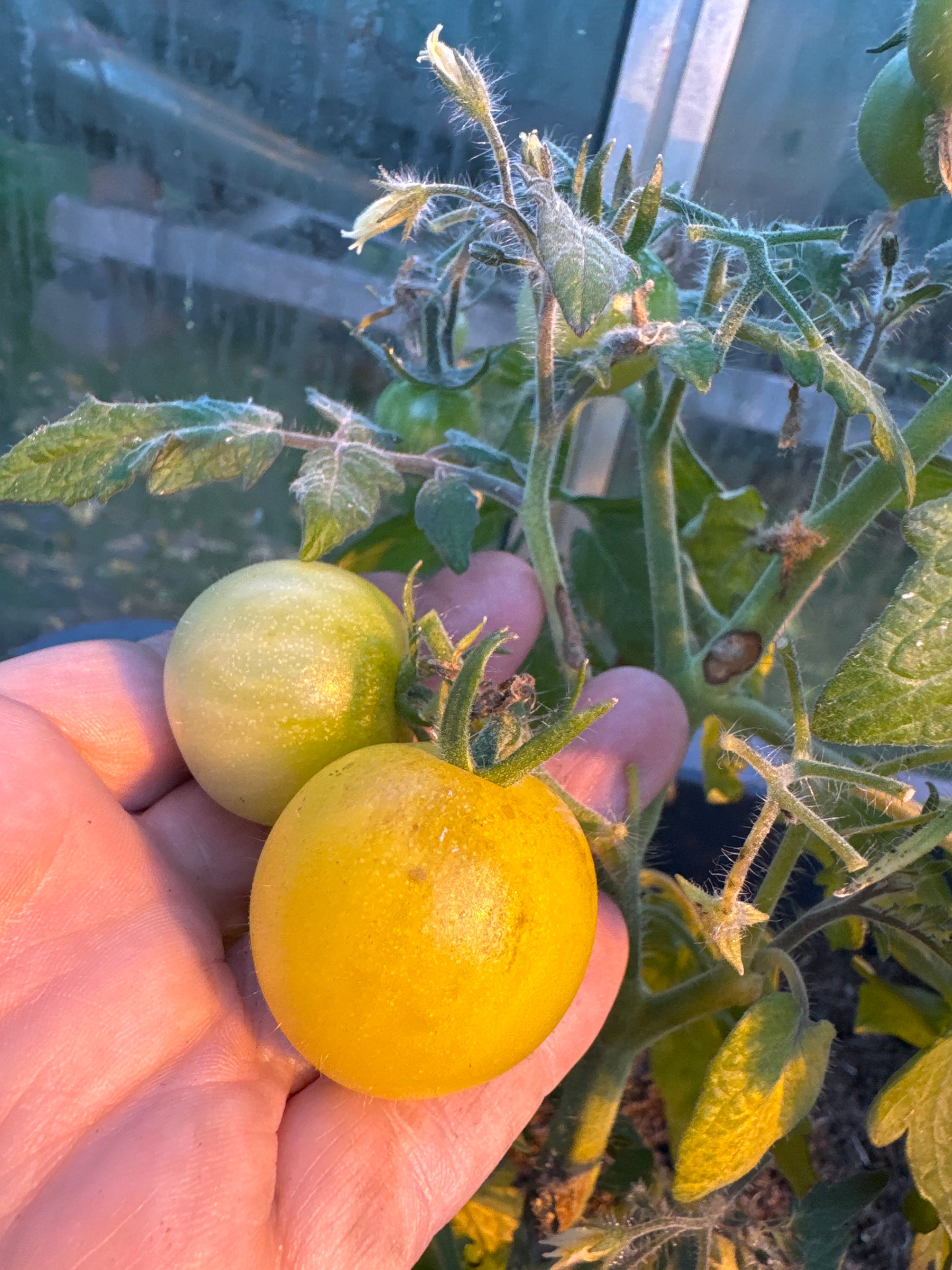 Runde cherrytomater i klaser på små planter. Saftige, gyllengule frukter med en mild og søt tomatsmak. Vanlige blader.