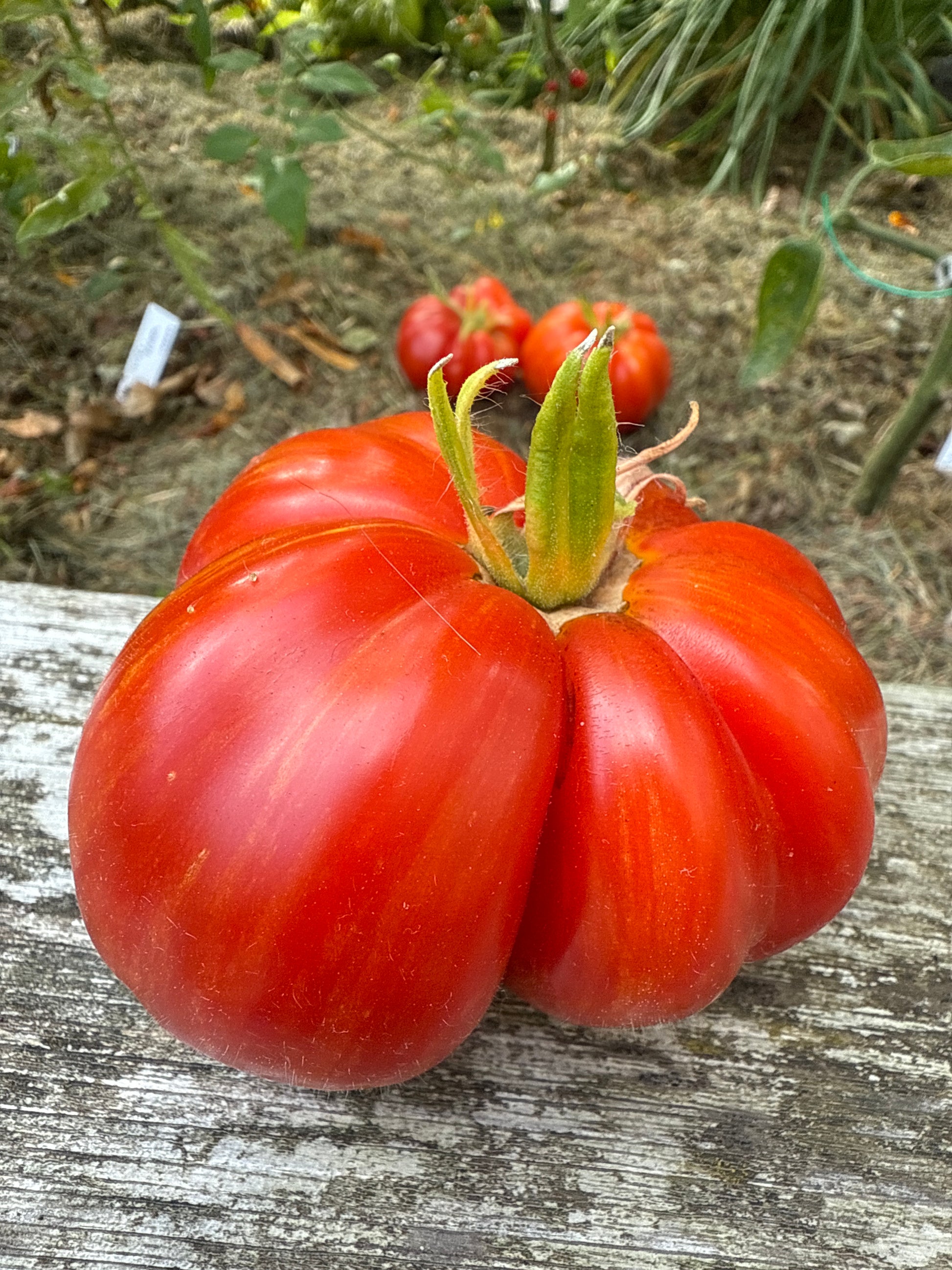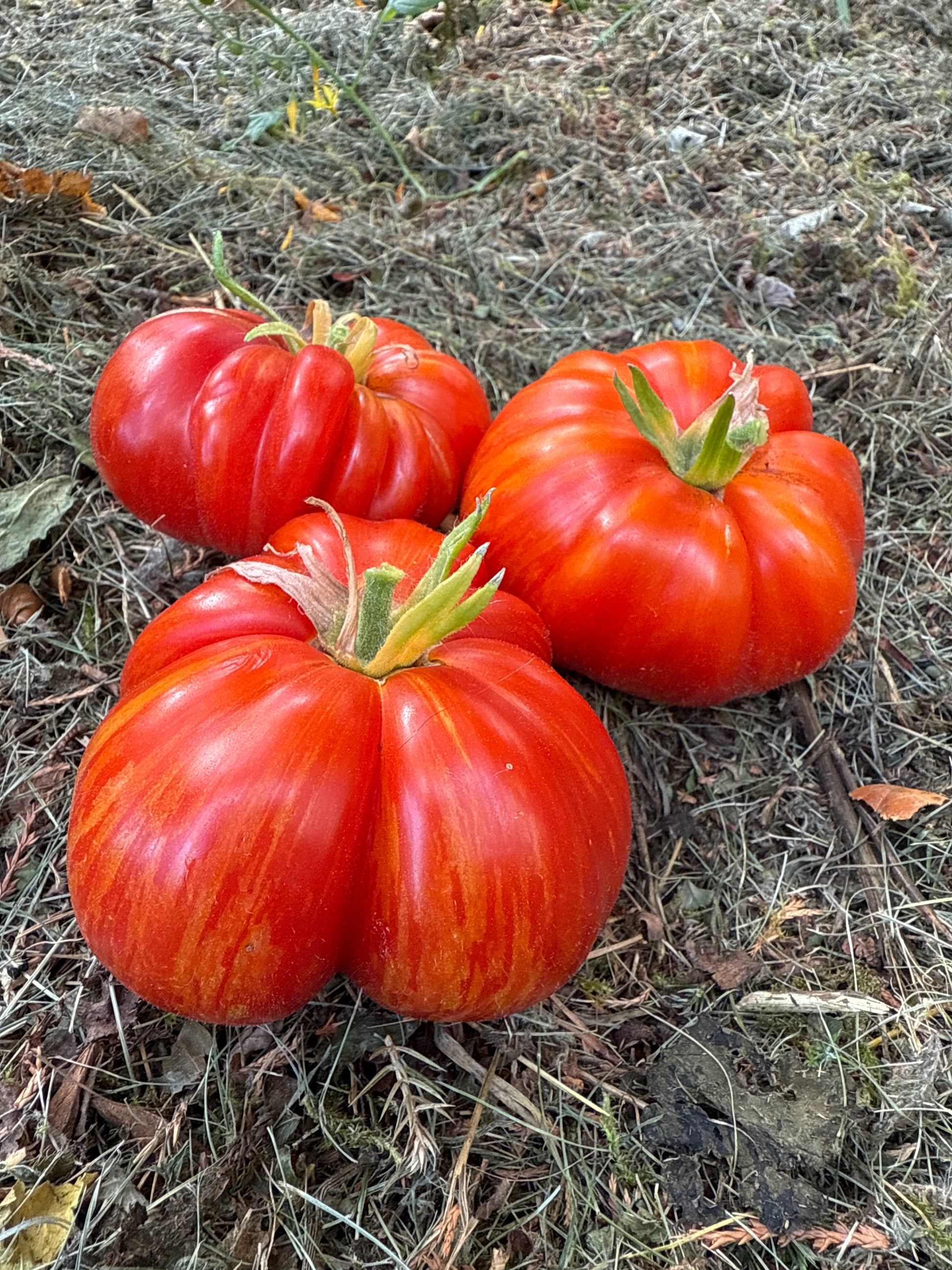 Rød/gul stripete tomater på ca 100-350 gram, smaken er frisk, med litt sødme og syre.