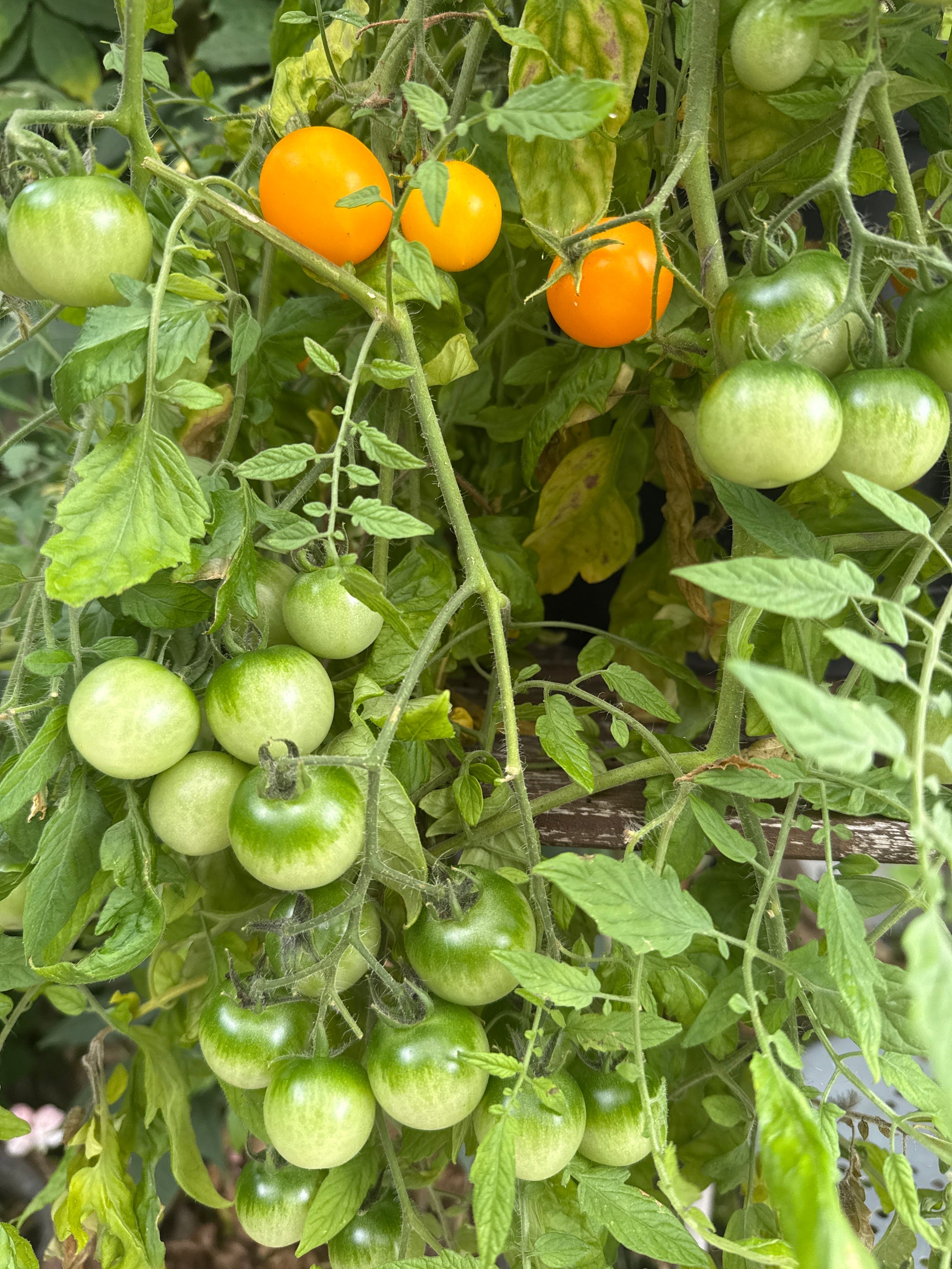 Planten bærer kaskader av lange klaser med guloransje cherry tomater, ganske store av størrelse.