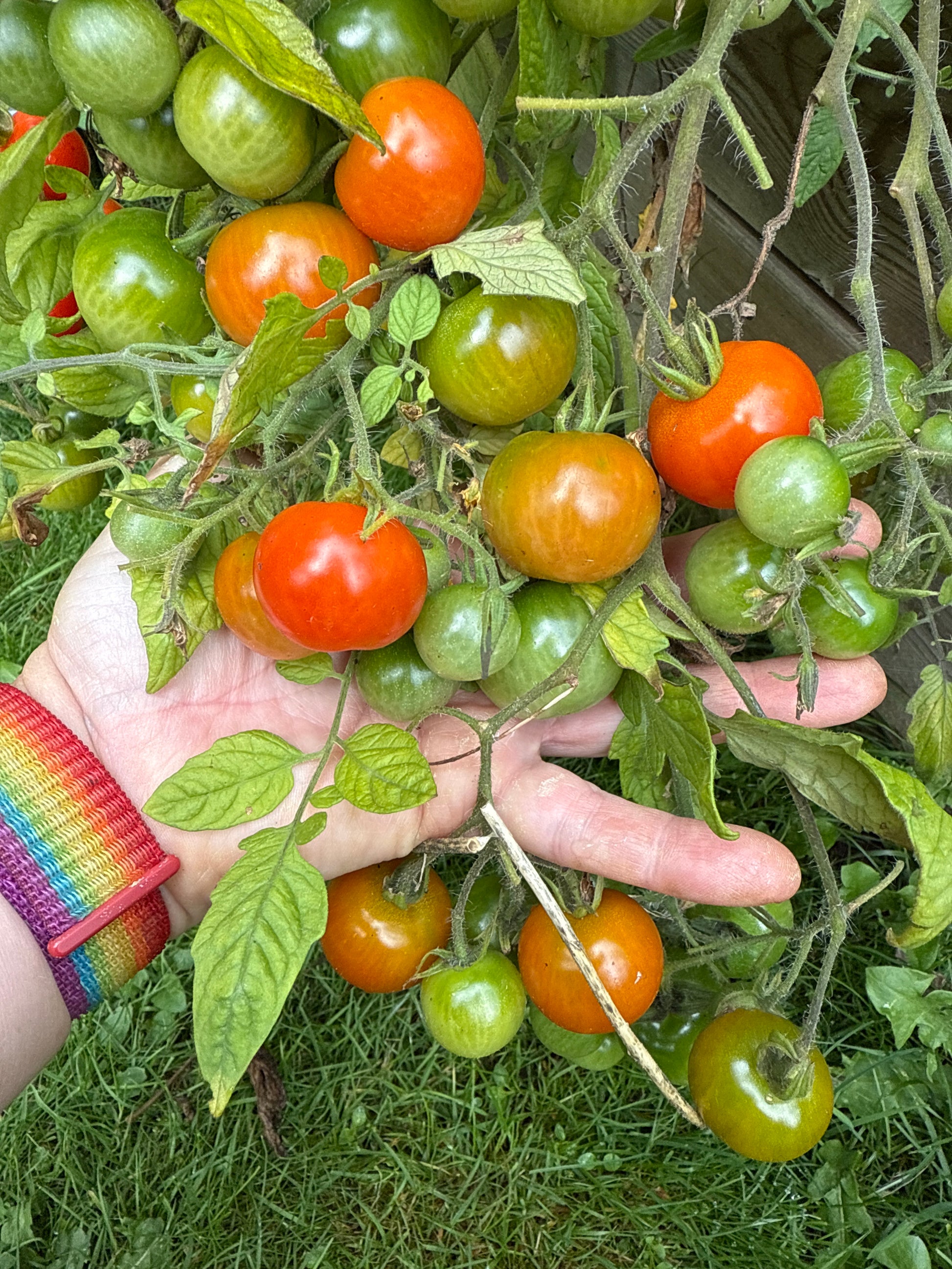 Planten bærer kaskader av lange klaser med knall røde cherry tomater, ganske store av størrelse.